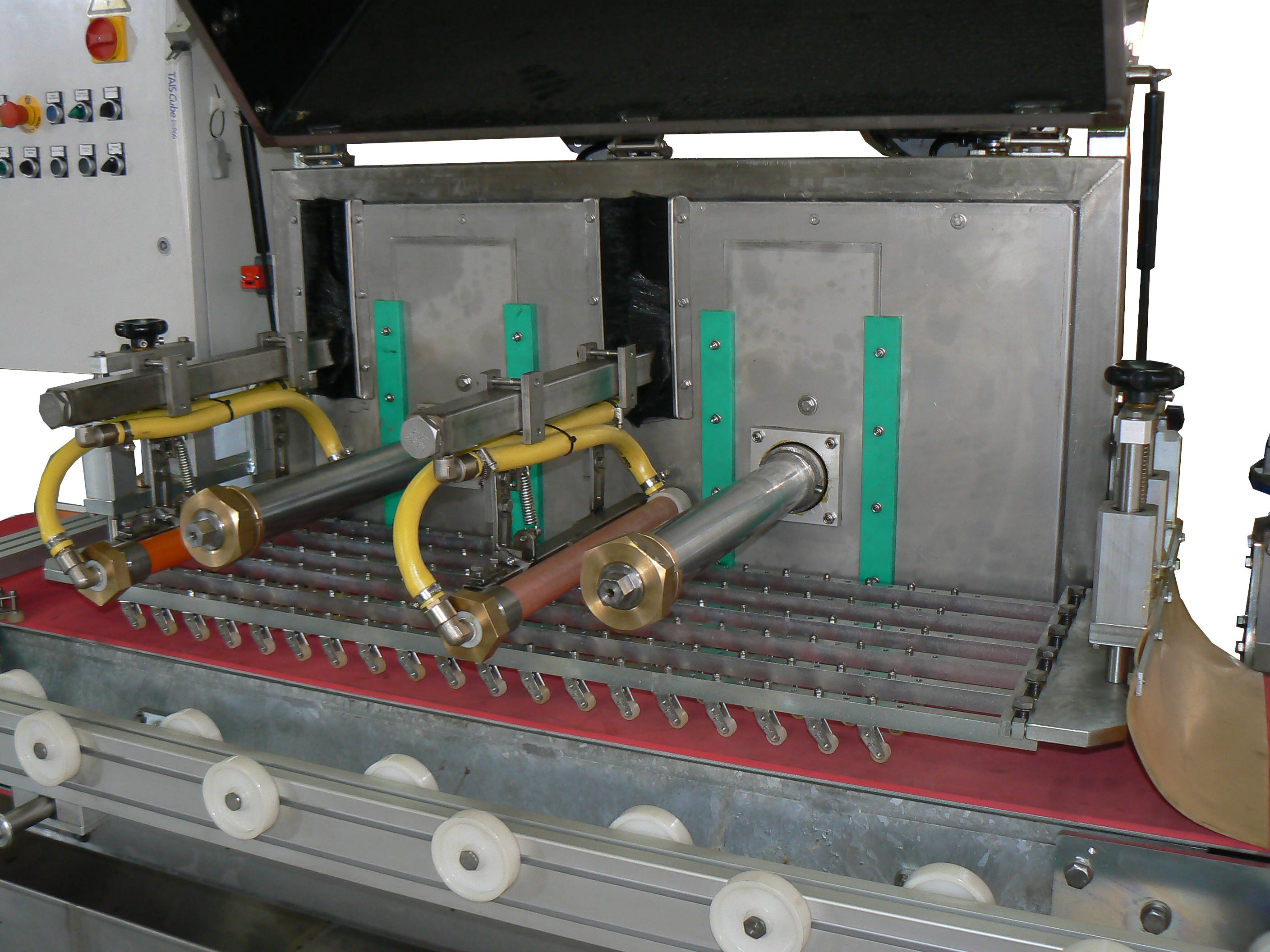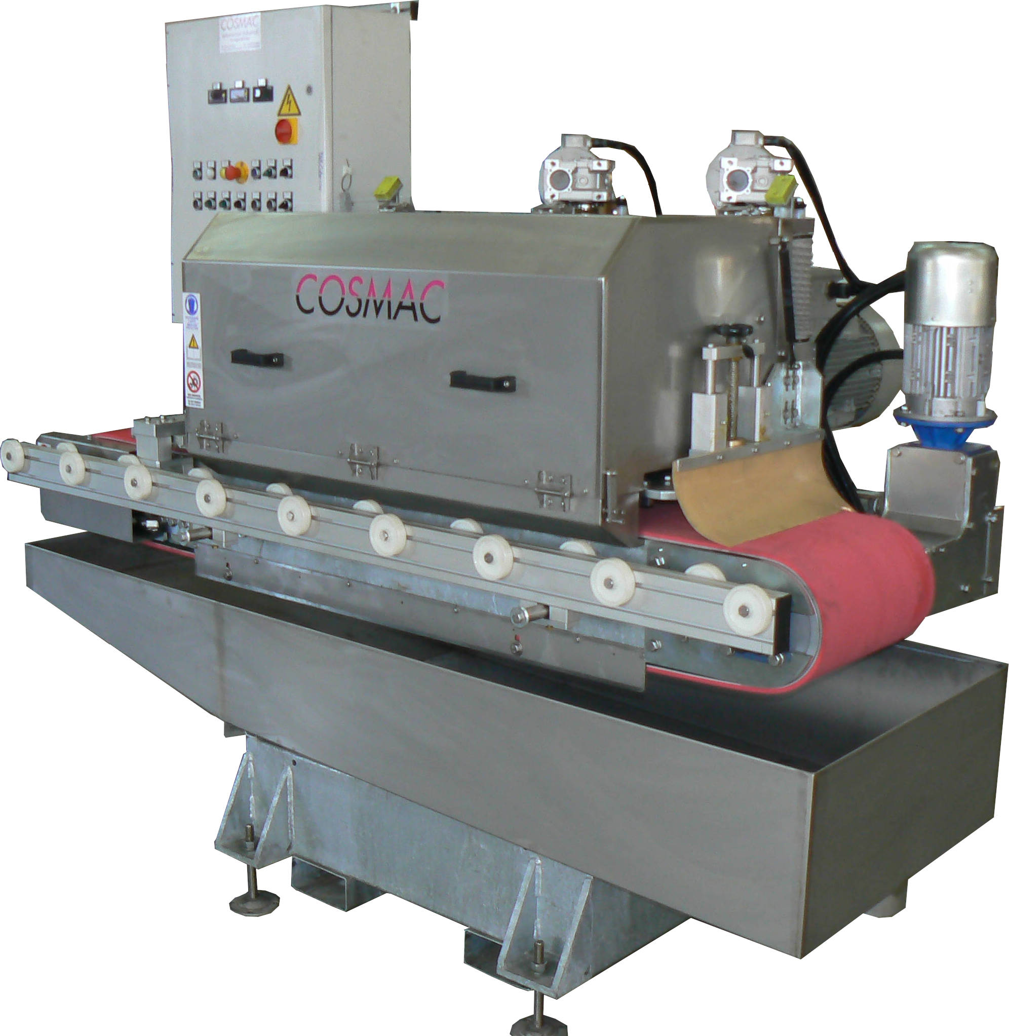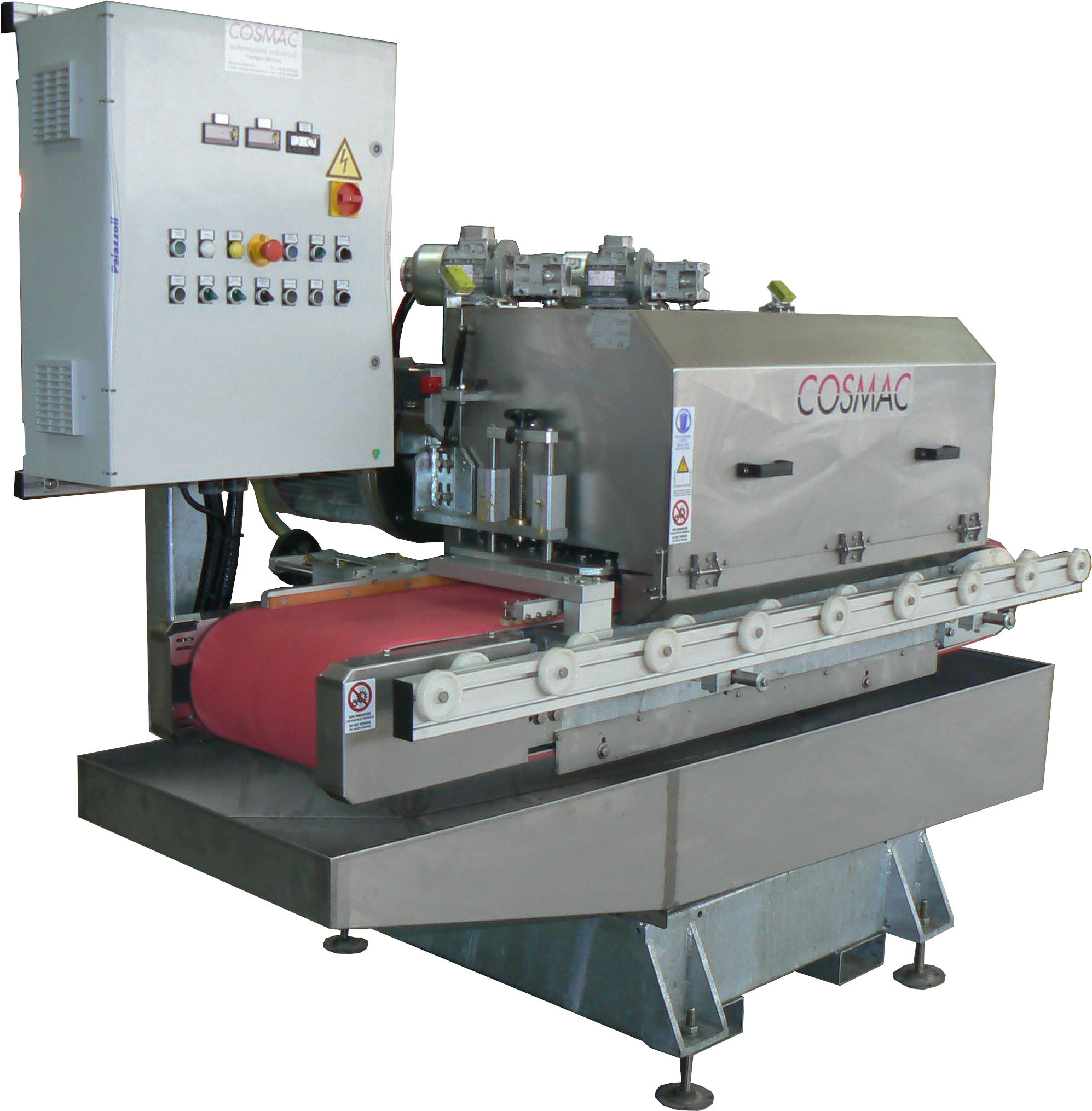 acchina per taglio lineare a nastro con struttura zincata a caldo e acciaio inox, a due teste di taglio con alberi supportati; i dischi diamantati per il taglio sono montati su canotti cromati e retificati permettendo una rapida sostituzione per il cambio formato.