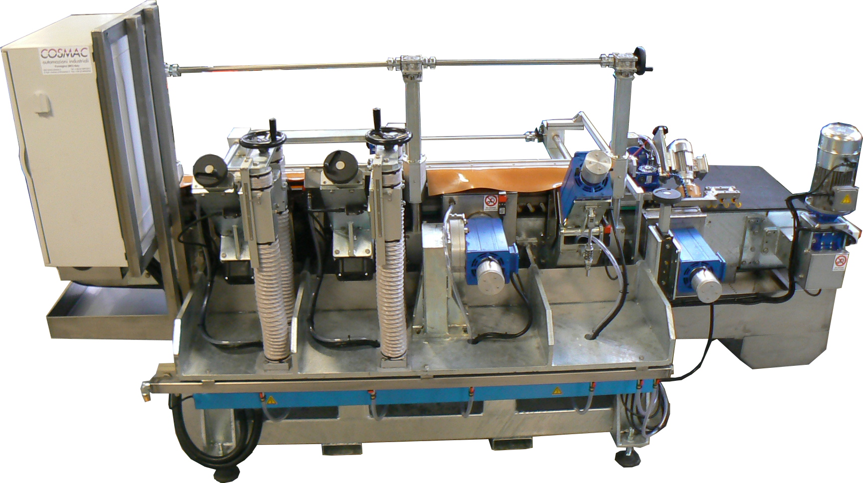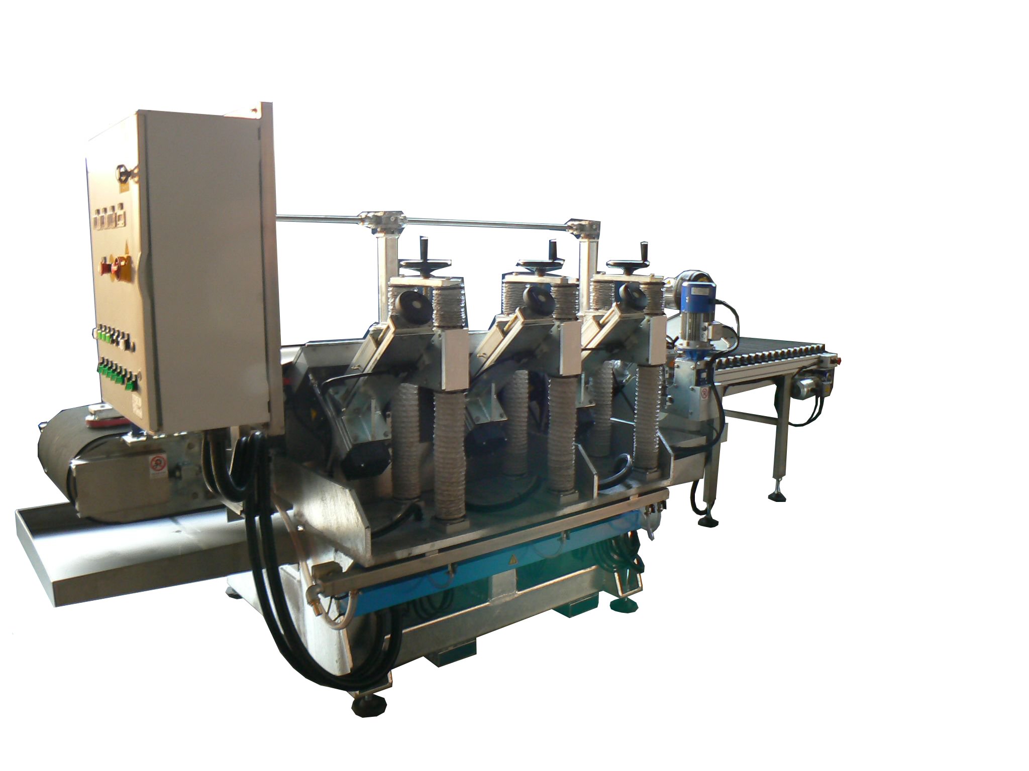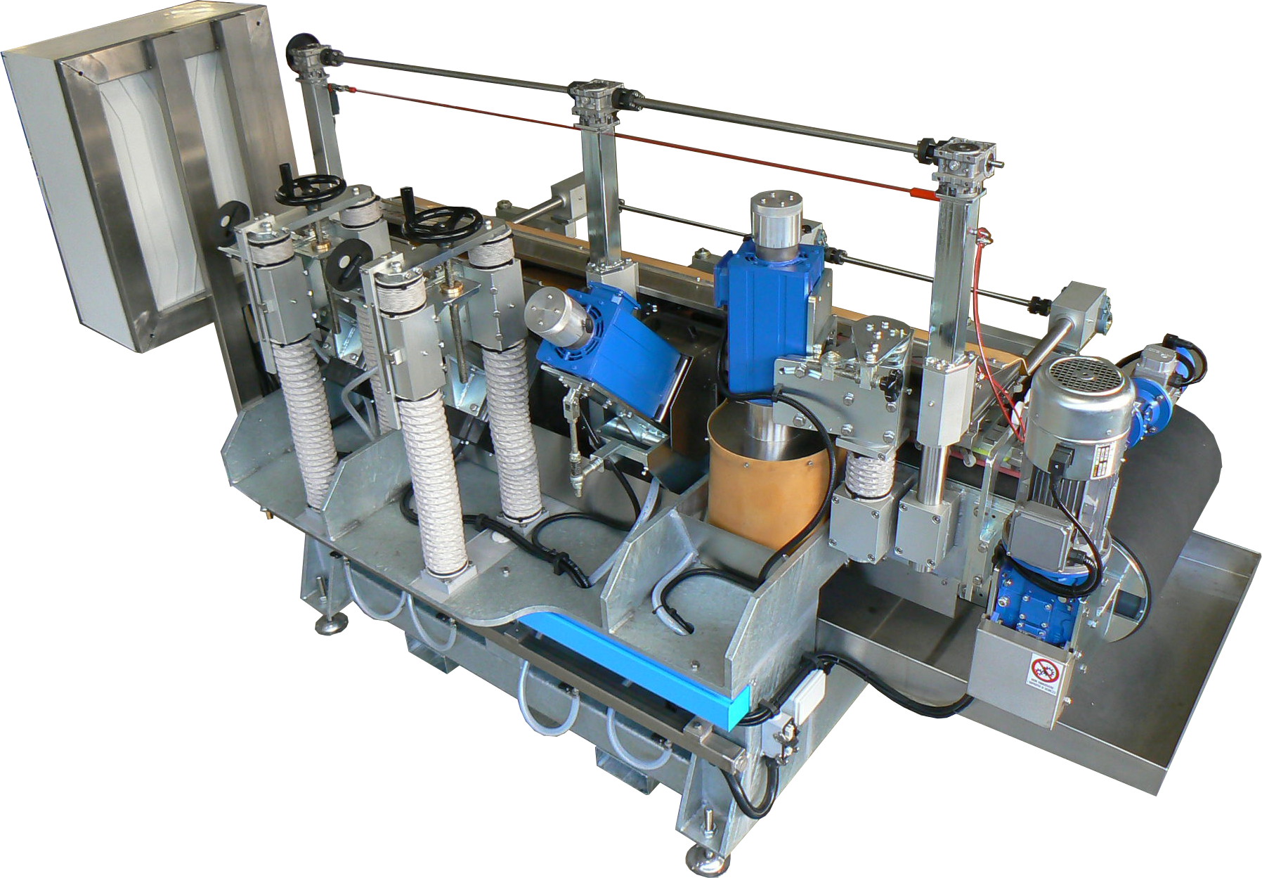 Questo sistema permette la lavorazione anche di piccoli formati; il trasporto del materiale è per mezzo di nastro a velocità variabile, il materiale viene guidato a tutta lunghezza con cinghia motorizzata a velocità sincronizzata con il nastro di trasporto.