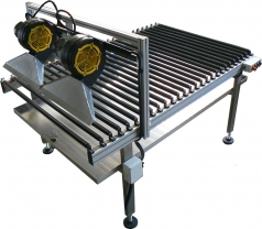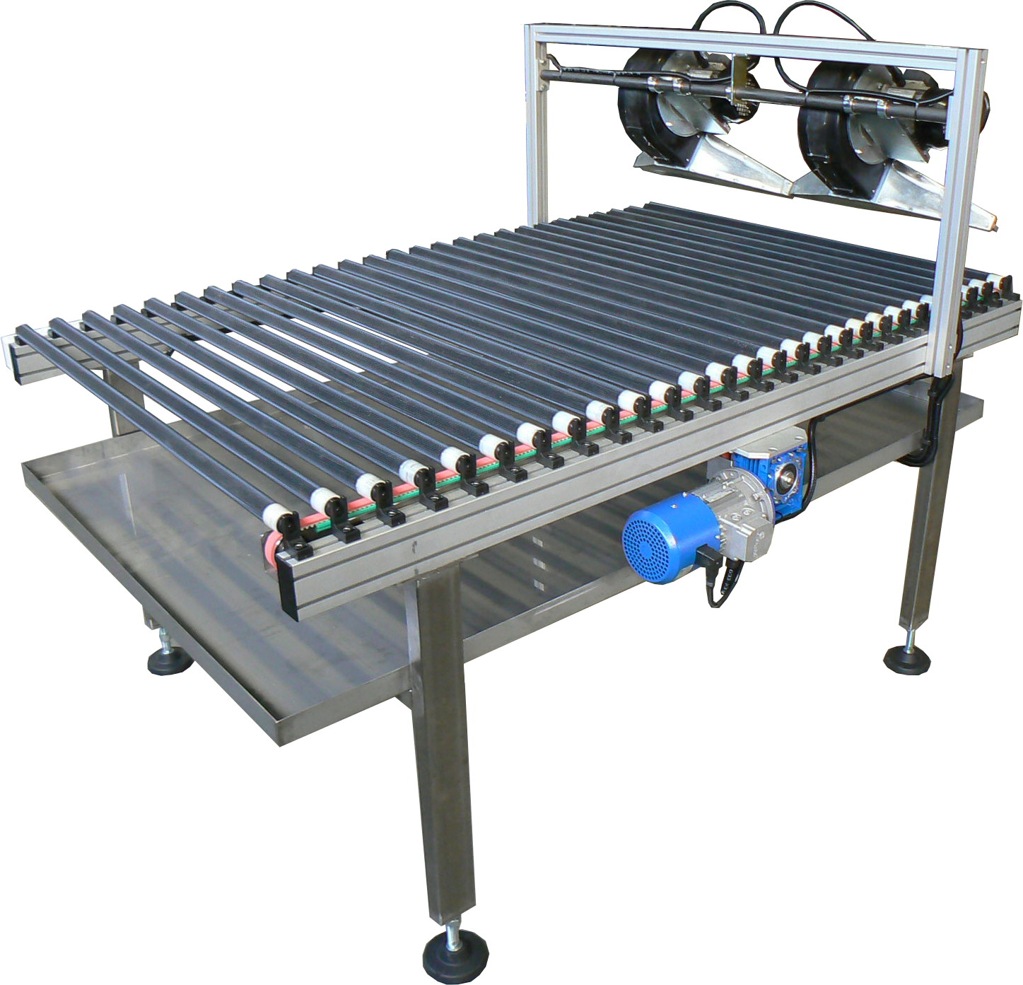Linea di trasporto a rulli motorizzati con ventola di soffiaggio per asciugatura del materiale.